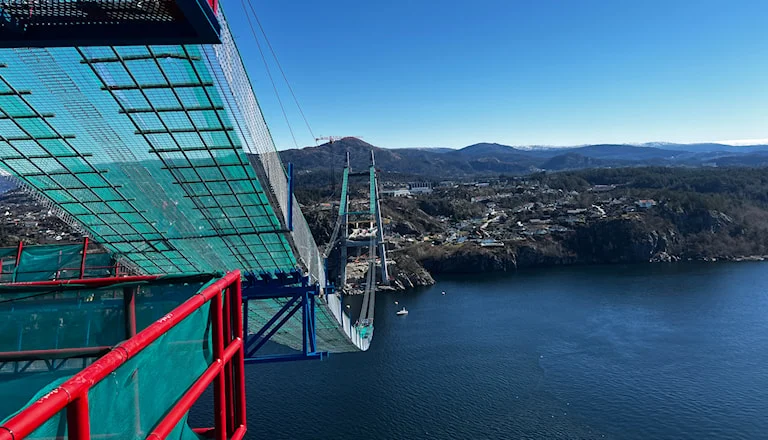 Luftig byggearbeid på Nye Sotrabru: Catwalken tar form over fjorden