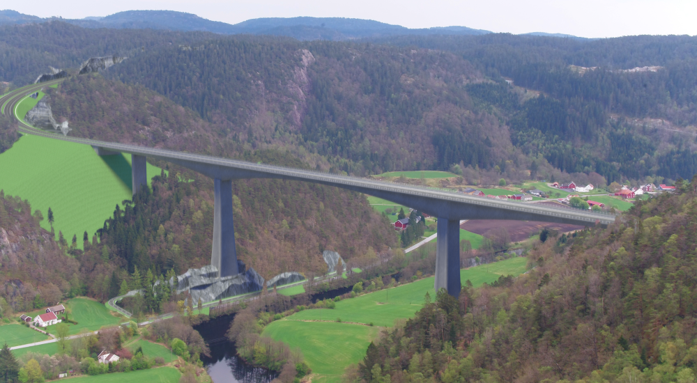 Illustrasjonen viser hvordan bruen over Audna i Lindesnes kommune kan se ut. Illustrasjon: Nye Veier