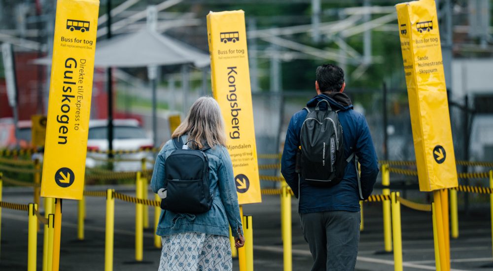 – Det skal være lett for deg å finne ut hvor du skal gå for å finne bussen. Vi bruker alltid gul farge for informasjon om buss for tog eller andre avvik fra det normale. Se etter gule skilt, plakater og flagg, oppfordrer Hansen.