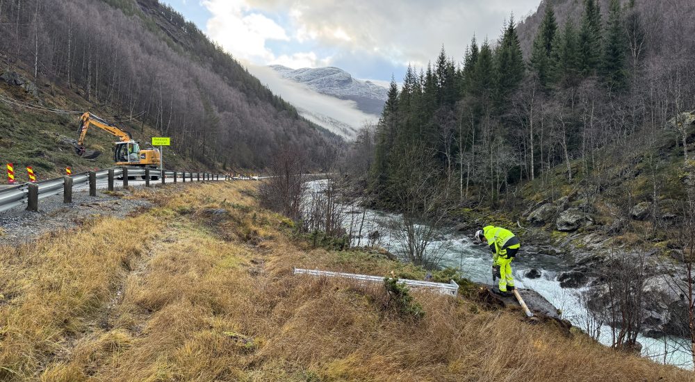 – Bevegelser på millimeternivå vil utløse alarm, sier Bjørnar Nevland Knudsen i Cautus Geo. Han har ledet arbeidet med å installere overvåkingen langs fylkesveien.