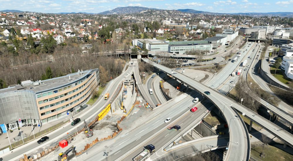 Dronebilde av Fornebukrysset. Arbeidet vil foregå i området mellom Granfosstunnelen (i midten av bildet), og E18. All trafikk vil flyttes over i det østgående løpet. Foto: Marius Larrarte Jacobsen/Statens vegvesen
